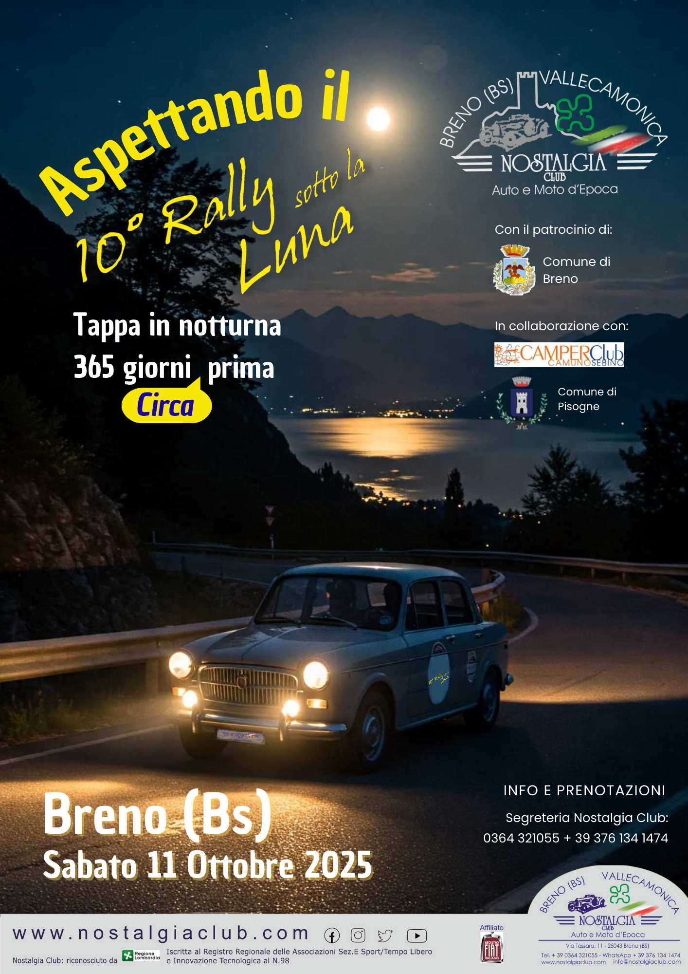 “Fortemente, vista anche la mia passione per le auto d' epoca, ho creduto nel progetto del Nostalgia Club di far ripartire questa importante iniziativa. Quest' anno si propone una versione "light", anticipando parte del tracciato che poi sarà percorso dal "vero" Rally sotto la Luna. Come amministrazione siamo sempre lieti di sostenere iniziative come questa, che danno lustro al paese di Breno.”