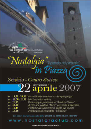 “Sezione Valtellina” del Nostalgia Club ti invita a partecipare Programma: Dalle 8.30 alle 10.00 Accreditamento vetture e consegna gadget Dalle 10.00 alle 11.30 Mostra statica vetture Alle 11.30 Prepararsi in vettura Alle 11,35 Partenza gita panoramica “Sondrio Chiuro” Alle 12.00 Arrivo alle cantine “Nera” con visita e aperitivo Alle 12.45 Partenza da Chiuro verso Teglio per pranzo Dalle 13,15 Pranzo presso ristorante “Combolo” Il costo di iscrizione vettura e conducente compreso di aperitivo e pranzo €30,00 Accompagnatori € 25,00.Si prega di confermare entro giovedì 19 Aprile per prenotazione ristorante Vista